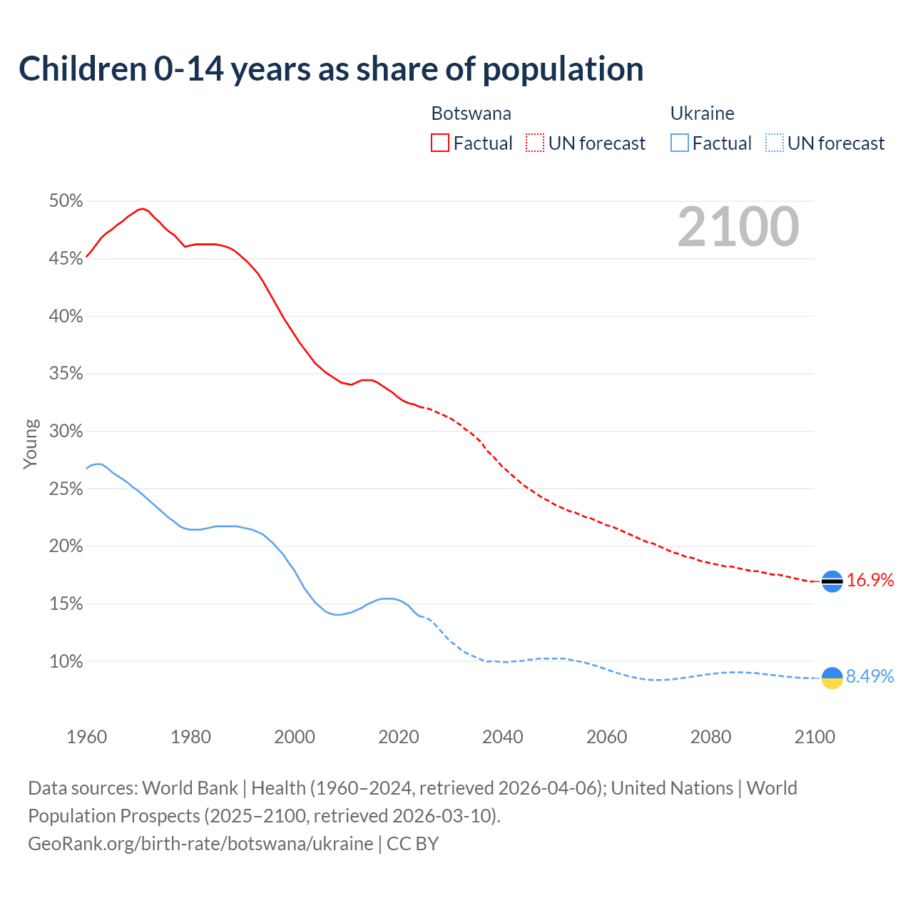 According to the latest available data on birth rates, the fertility rate in Botswana was 2.73 children per woman in 2023, compared to 0.98 in Ukraine in 2023. The replacement level is considered to be 2.1 children per woman.