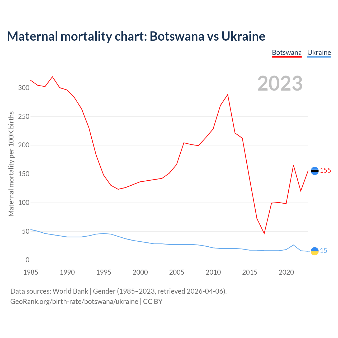 The maternal mortality rate, which is the probability of dying during childbirth or within 42 days of pregnancy termination, is 155 deaths per 100,000 live births in Botswana, compared to 15 deaths in Ukraine.