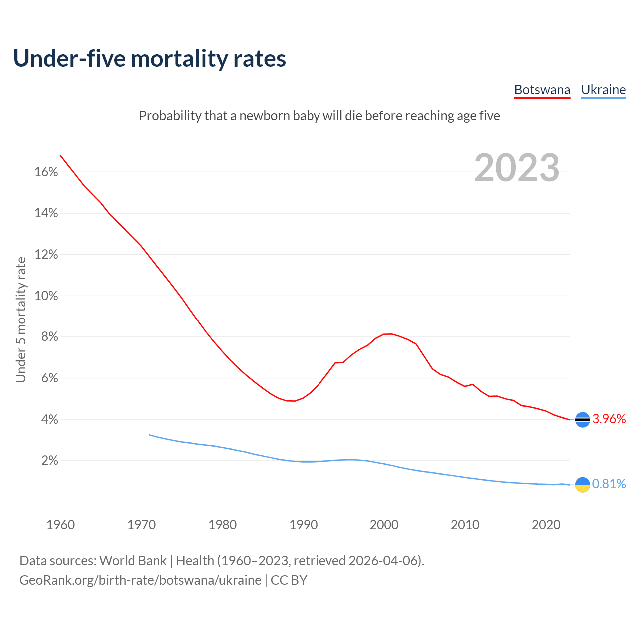The chance that a newborn baby will die before reaching age five is 3.96% in Botswana and 0.81% in Ukraine. Above is a chart with historical data on under-five mortality rates.