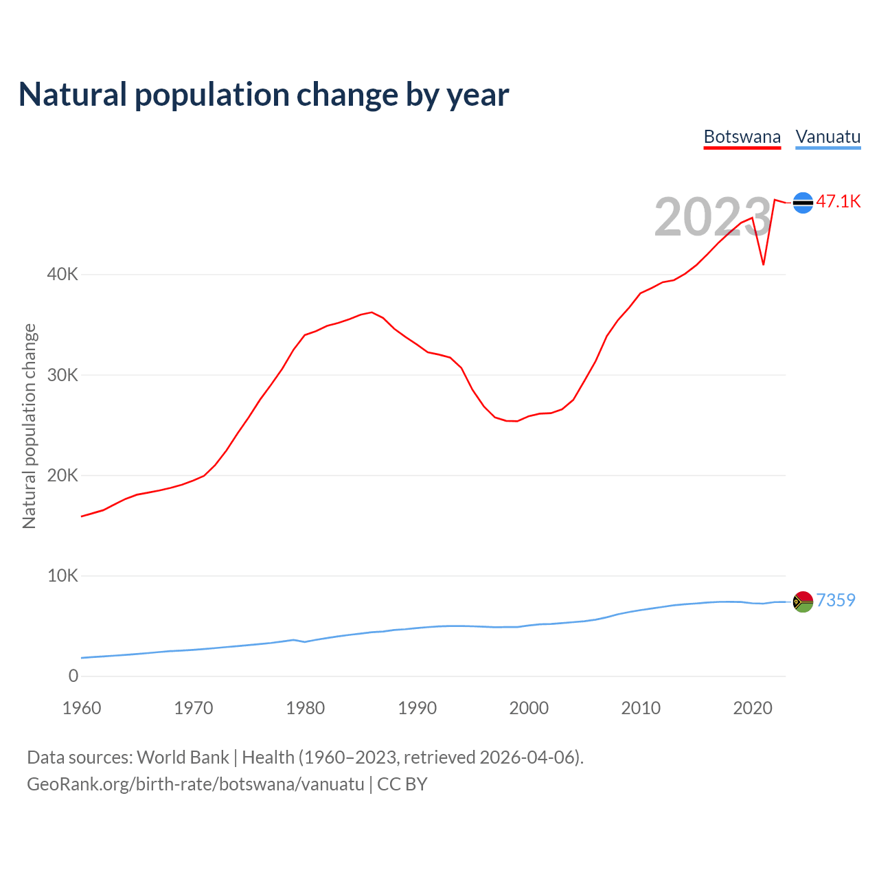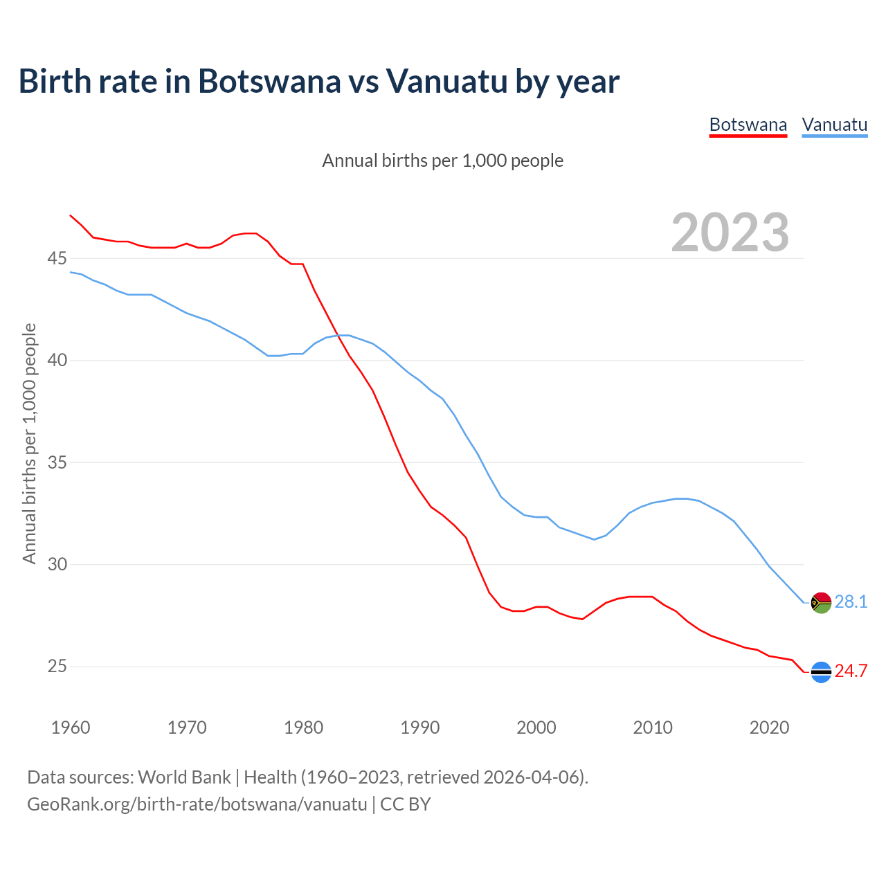 Botswana has an annual birth rate of 24.7 births per 1,000 people, compared to 28.1 for Vanuatu. The average number of children a woman is expected to have during her lifetime — the fertility rate, is 2.73 in Botswana and 3.6 in Vanuatu — 31.6% difference.