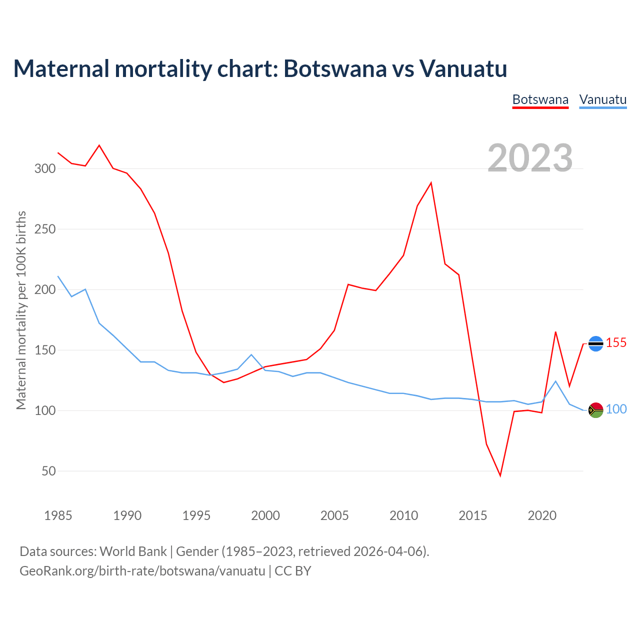 The maternal mortality rate, which is the probability of dying during childbirth or within 42 days of pregnancy termination, is 155 deaths per 100,000 live births in Botswana, compared to 100 deaths in Vanuatu.