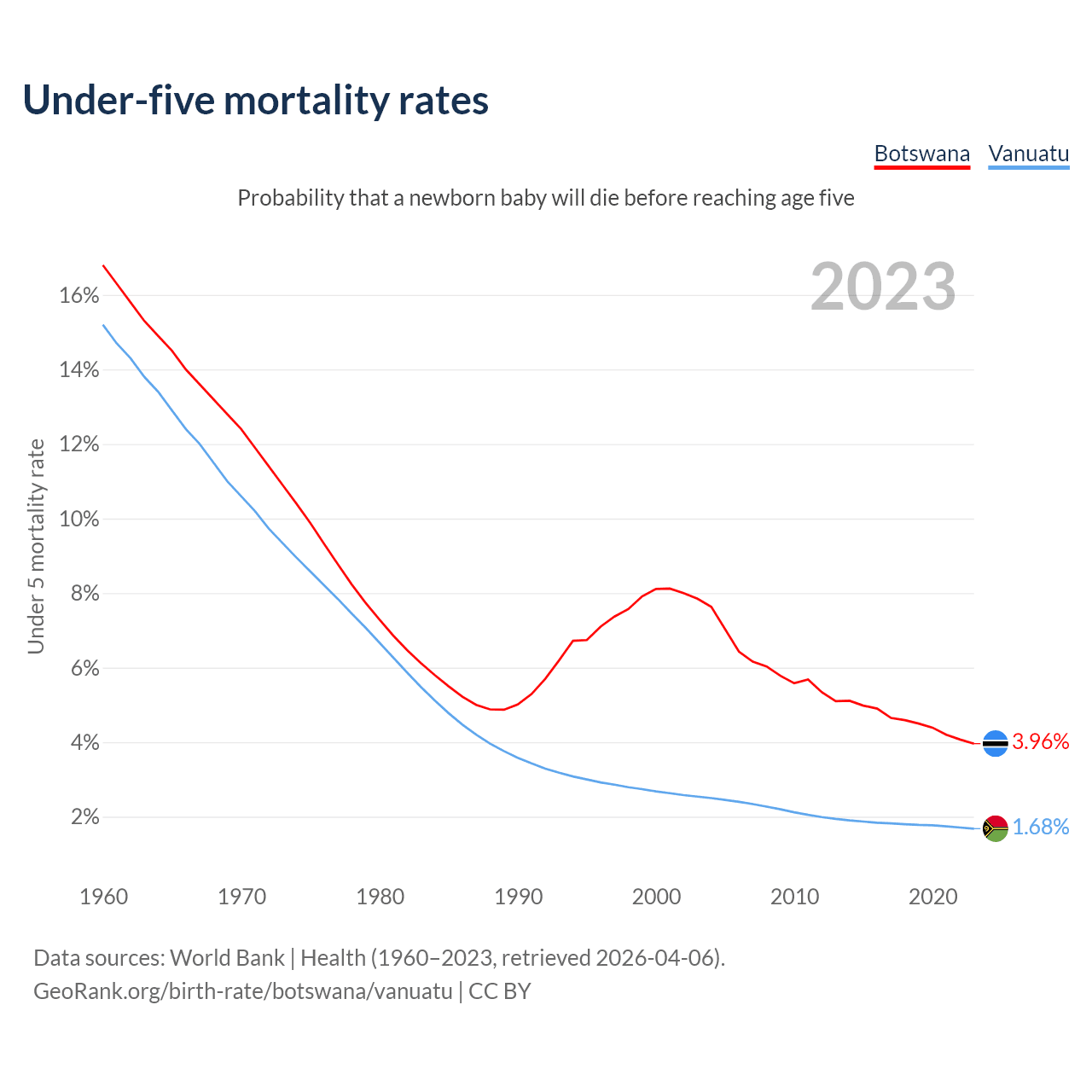 The chance that a newborn baby will die before reaching age five is 3.96% in Botswana and 1.68% in Vanuatu. Above is a chart with historical data on under-five mortality rates.