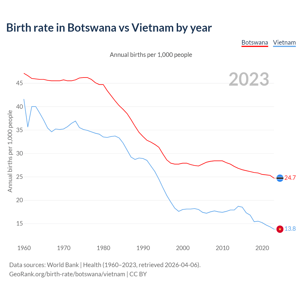 Botswana has an annual birth rate of 24.7 births per 1,000 people, compared to 13.8 for Vietnam. The average number of children a woman is expected to have during her lifetime — the fertility rate, is 2.73 in Botswana and 1.91 in Vietnam — 30% difference.