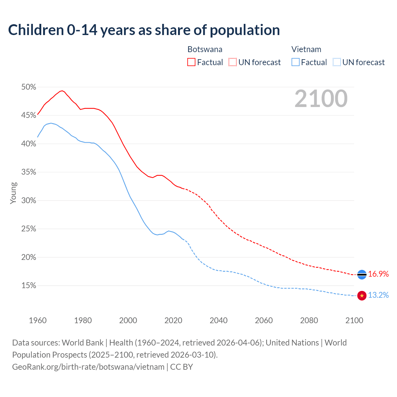 According to the latest available data on birth rates, the fertility rate in Botswana was 2.73 children per woman in 2023, compared to 1.91 in Vietnam in 2023. The replacement level is considered to be 2.1 children per woman.