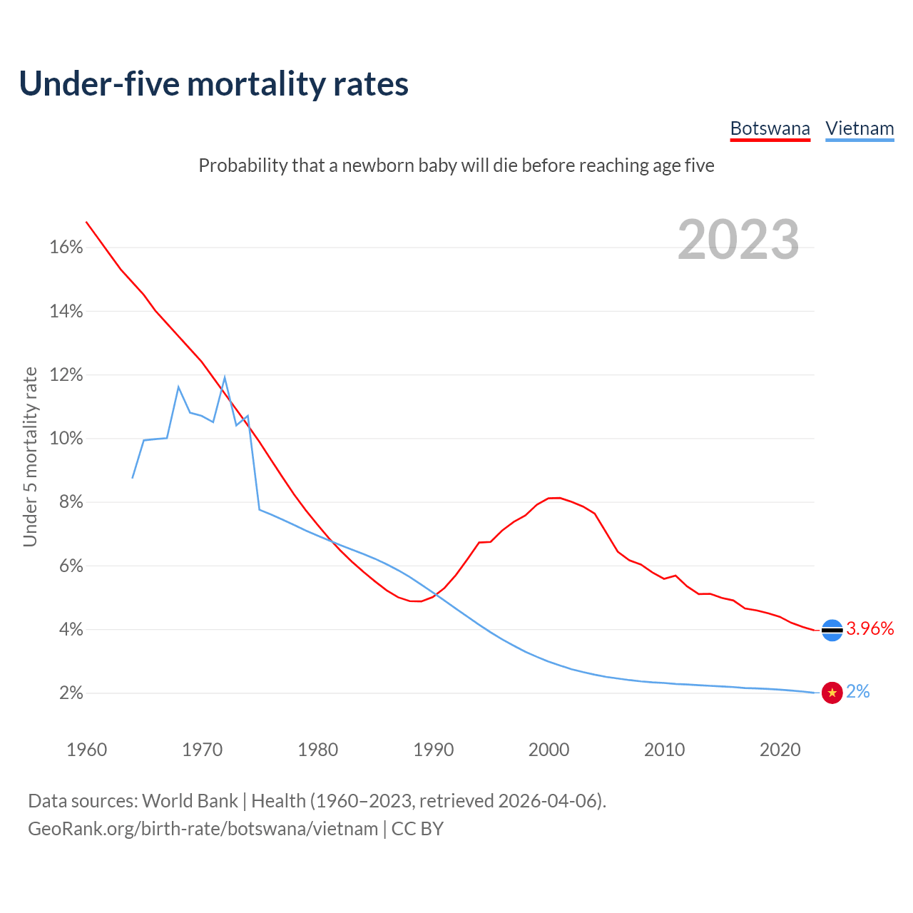 The chance that a newborn baby will die before reaching age five is 3.96% in Botswana and 2% in Vietnam. Above is a chart with historical data on under-five mortality rates.