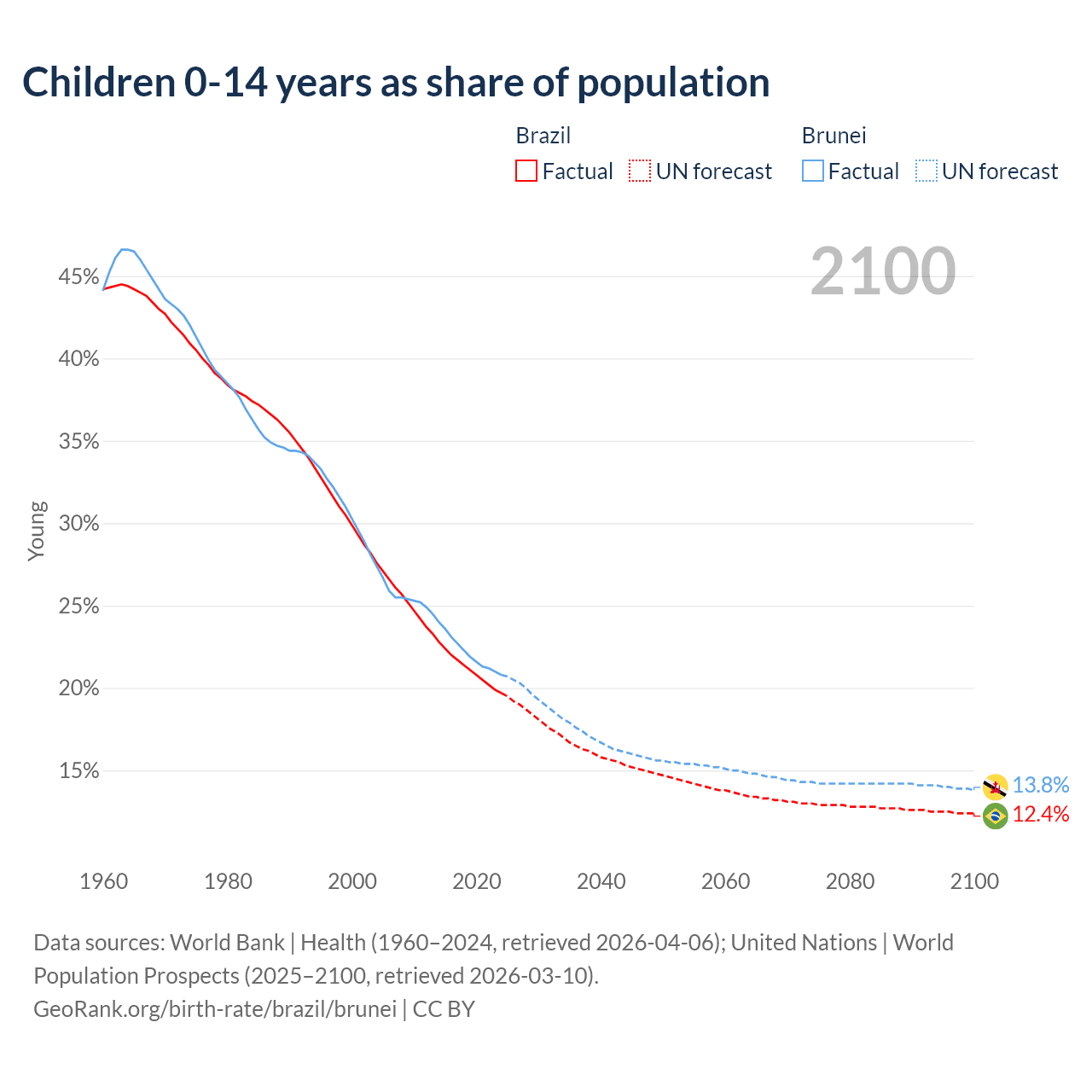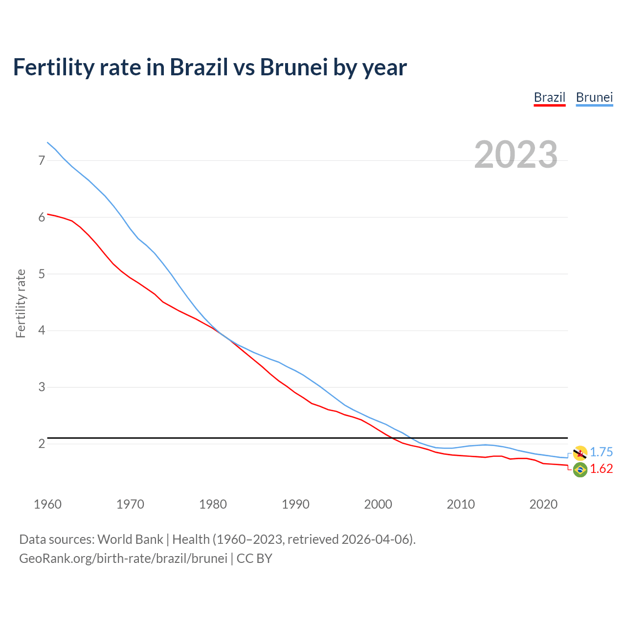 According to the latest available data on birth rates, the fertility rate in Brazil was 1.62 children per woman in 2023, compared to 1.75 in Brunei in 2023. The replacement level is considered to be 2.1 children per woman.