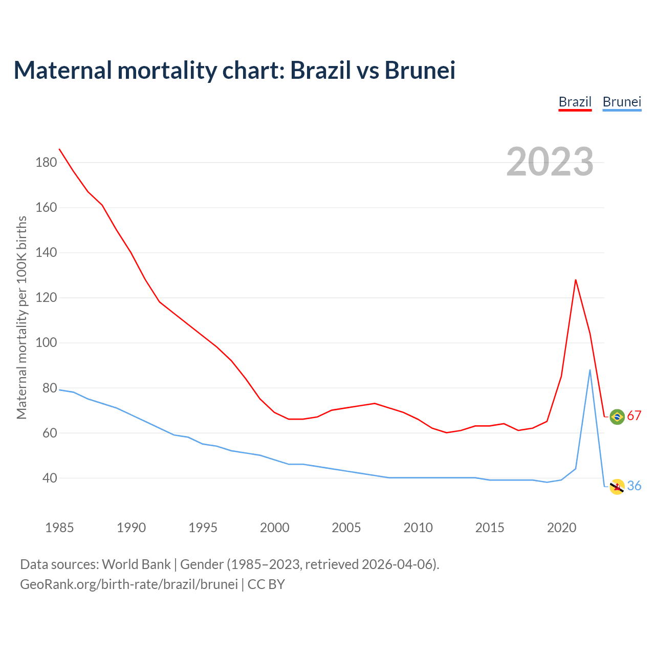 The maternal mortality rate, which is the probability of dying during childbirth or within 42 days of pregnancy termination, is 67 deaths per 100,000 live births in Brazil, compared to 36 deaths in Brunei.