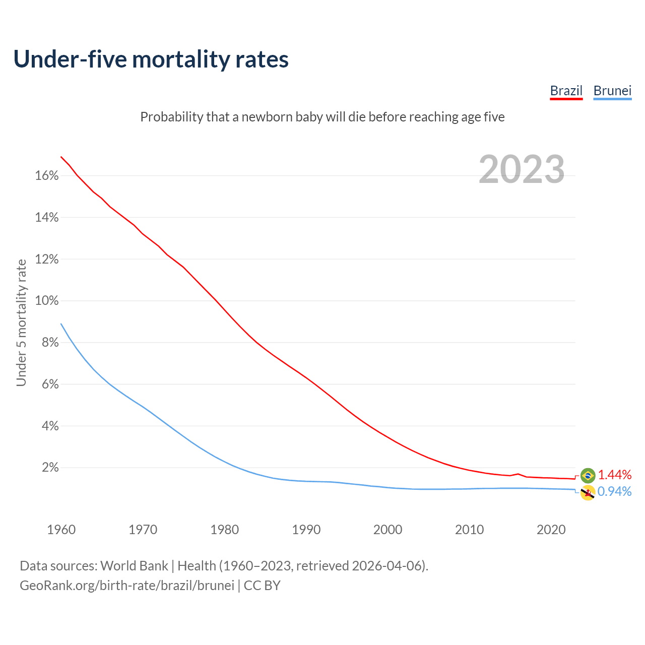 The chance that a newborn baby will die before reaching age five is 1.44% in Brazil and 0.94% in Brunei. Above is a chart with historical data on under-five mortality rates.
