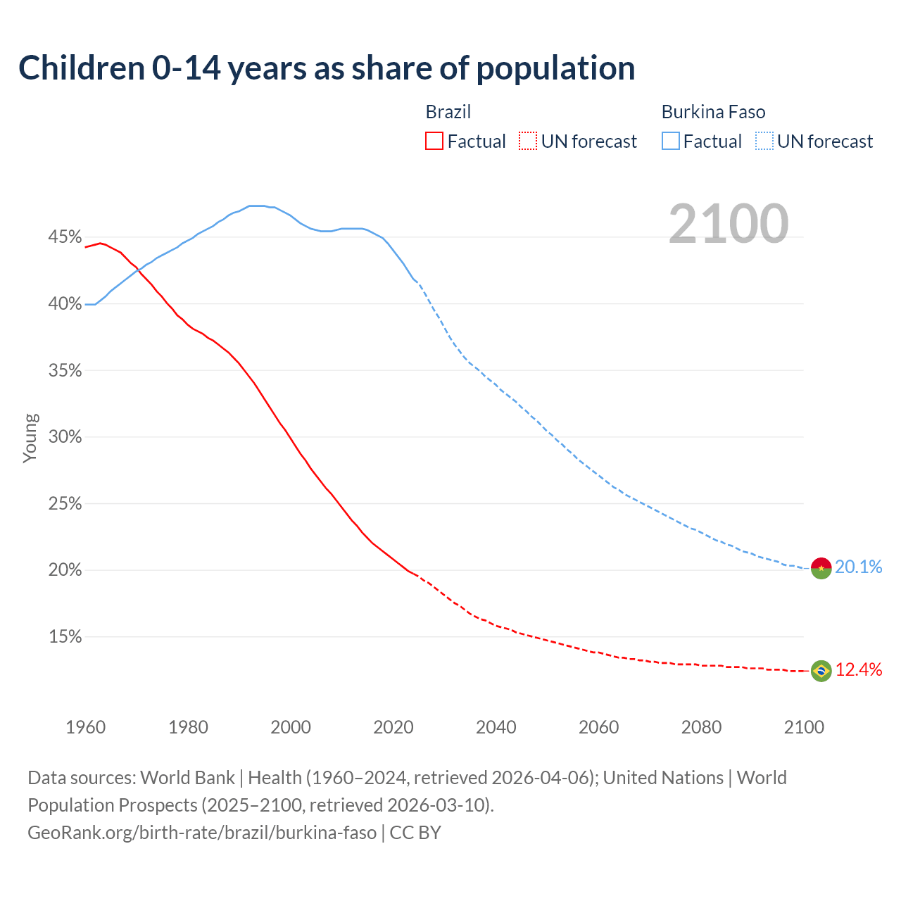 Brazil has an annual birth rate of 12.3 births per 1,000 people, compared to 31.6 for Burkina Faso. The average number of children a woman is expected to have during her lifetime — the fertility rate, is 1.62 in Brazil and 4.19 in Burkina Faso — 158.6% difference.