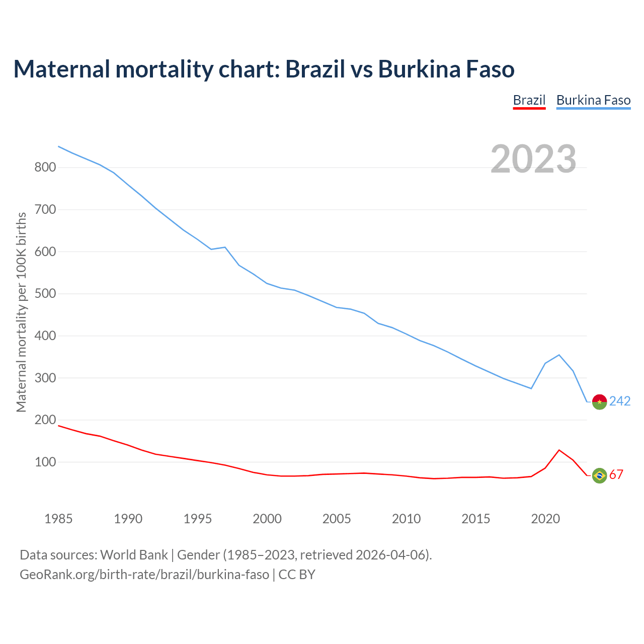 The maternal mortality rate, which is the probability of dying during childbirth or within 42 days of pregnancy termination, is 67 deaths per 100,000 live births in Brazil, compared to 242 deaths in Burkina Faso.
