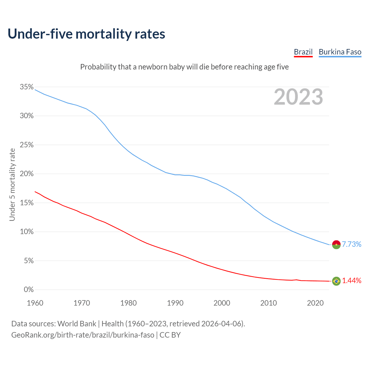 The chance that a newborn baby will die before reaching age five is 1.44% in Brazil and 7.73% in Burkina Faso. Above is a chart with historical data on under-five mortality rates.