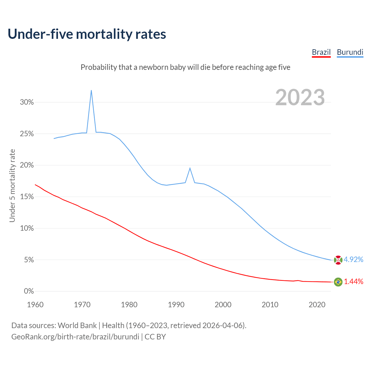 The chance that a newborn baby will die before reaching age five is 1.44% in Brazil and 4.92% in Burundi. Above is a chart with historical data on under-five mortality rates.