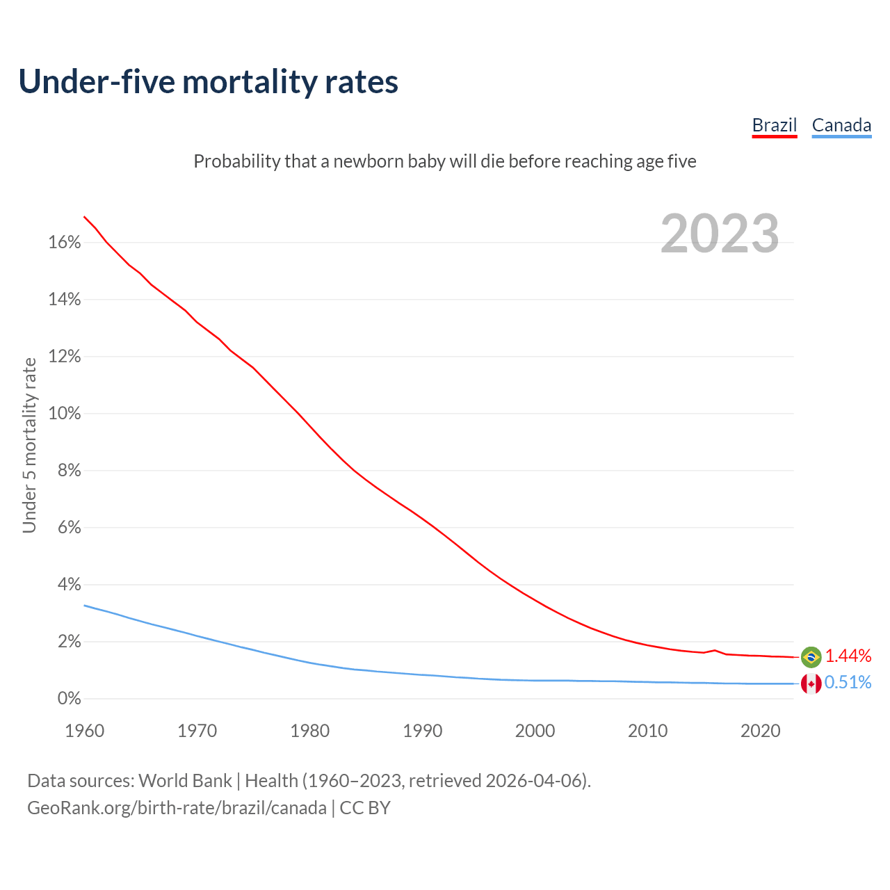 The chance that a newborn baby will die before reaching age five is 1.44% in Brazil and 0.51% in Canada. Above is a chart with historical data on under-five mortality rates.