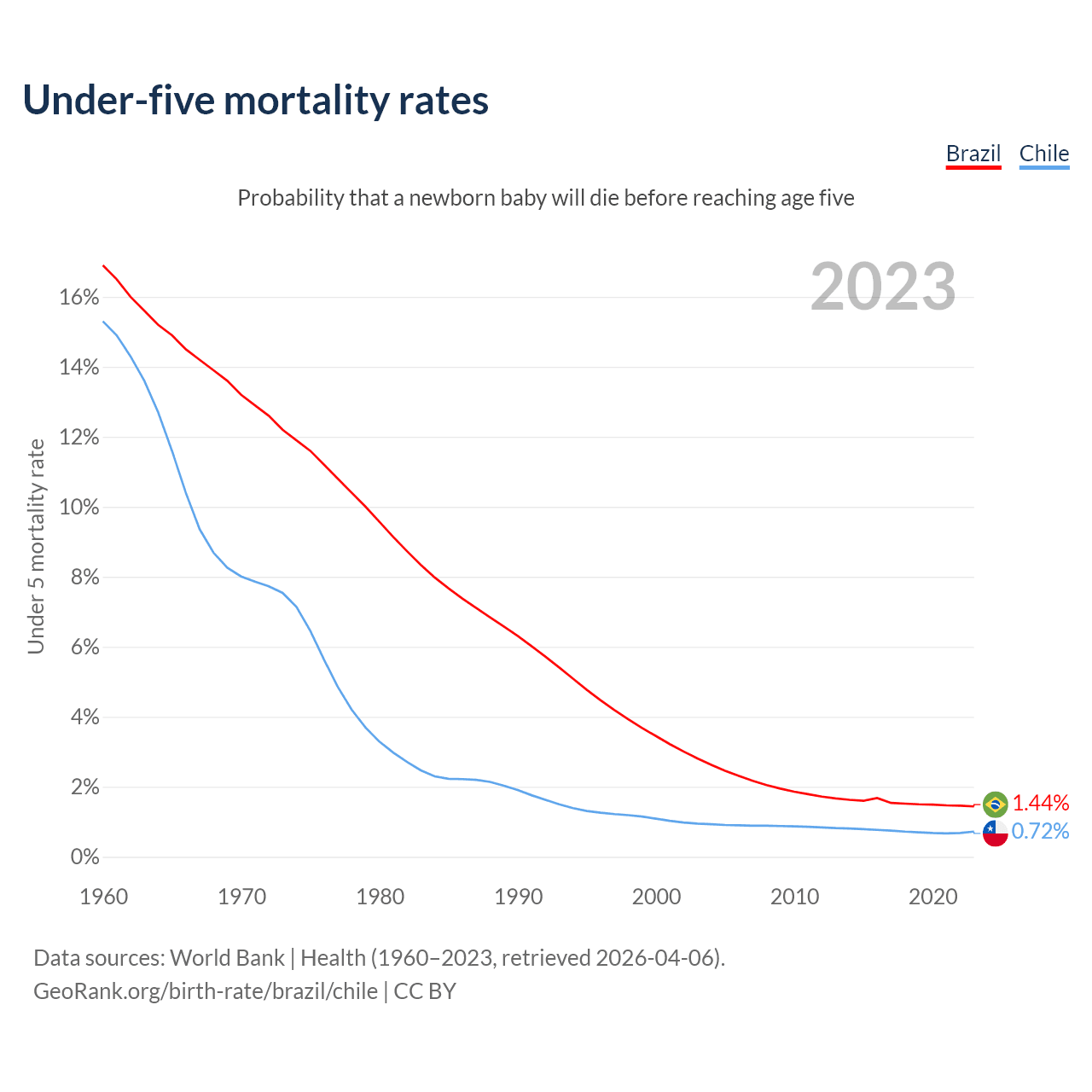 The chance that a newborn baby will die before reaching age five is 1.44% in Brazil and 0.72% in Chile. Above is a chart with historical data on under-five mortality rates.