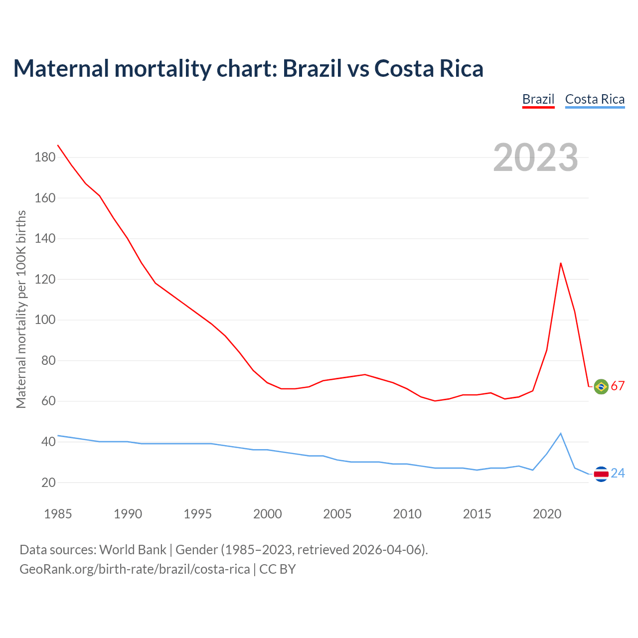 The maternal mortality rate, which is the probability of dying during childbirth or within 42 days of pregnancy termination, is 67 deaths per 100,000 live births in Brazil, compared to 24 deaths in Costa Rica.