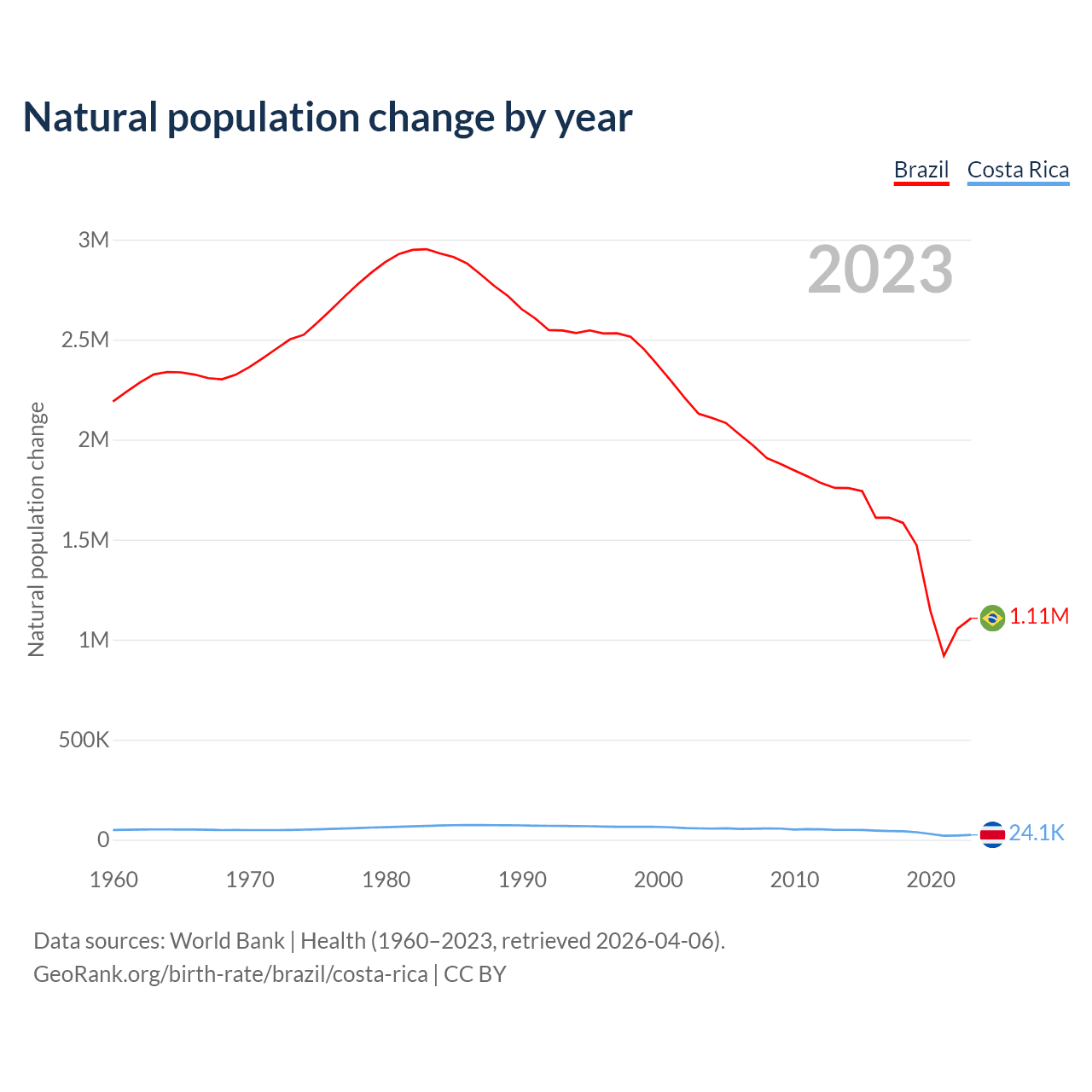 1960 vs 2023, the fertility rate has decreased by 73.2% in Brazil and by 80.2% in Costa Rica — in 1960, it was 6.05 and 6.71, respectively.