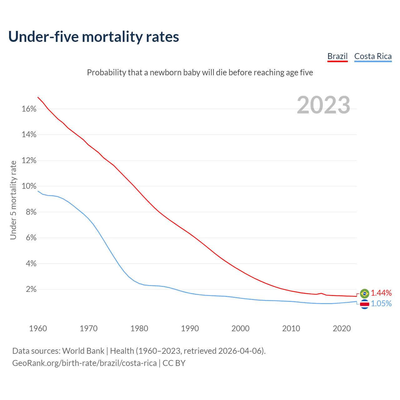 The chance that a newborn baby will die before reaching age five is 1.44% in Brazil and 1.05% in Costa Rica. Above is a chart with historical data on under-five mortality rates.
