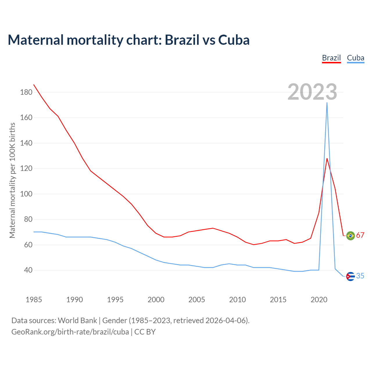 The maternal mortality rate, which is the probability of dying during childbirth or within 42 days of pregnancy termination, is 67 deaths per 100,000 live births in Brazil, compared to 35 deaths in Cuba.