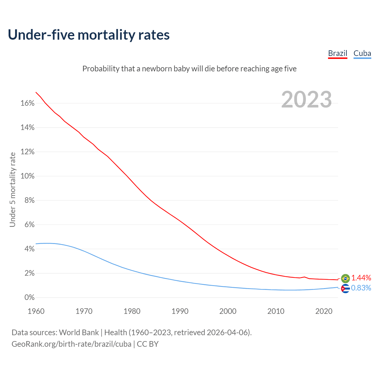 The chance that a newborn baby will die before reaching age five is 1.44% in Brazil and 0.83% in Cuba. Above is a chart with historical data on under-five mortality rates.