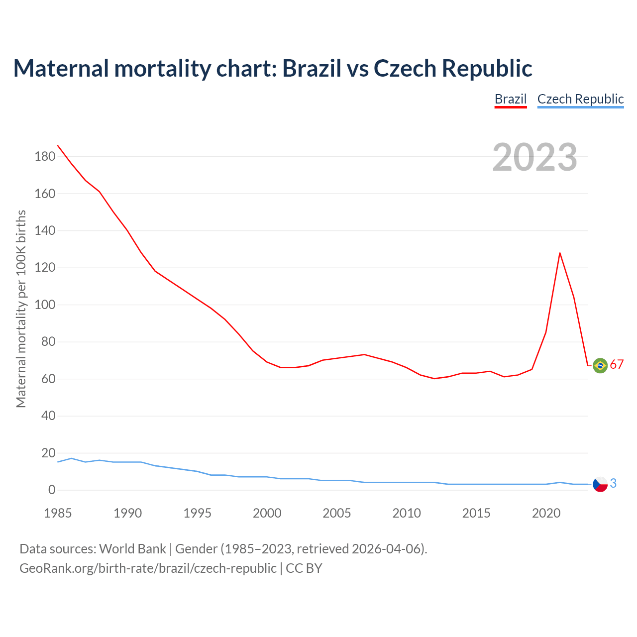 The maternal mortality rate, which is the probability of dying during childbirth or within 42 days of pregnancy termination, is 67 deaths per 100,000 live births in Brazil, compared to 3 deaths in the Czech Republic.