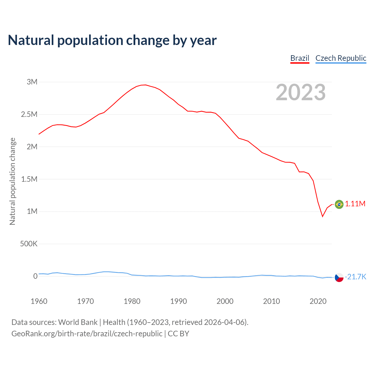 According to the latest available data on birth rates, the fertility rate in Brazil was 1.62 children per woman in 2023, compared to 1.45 in the Czech Republic in 2023. The replacement level is considered to be 2.1 children per woman.
