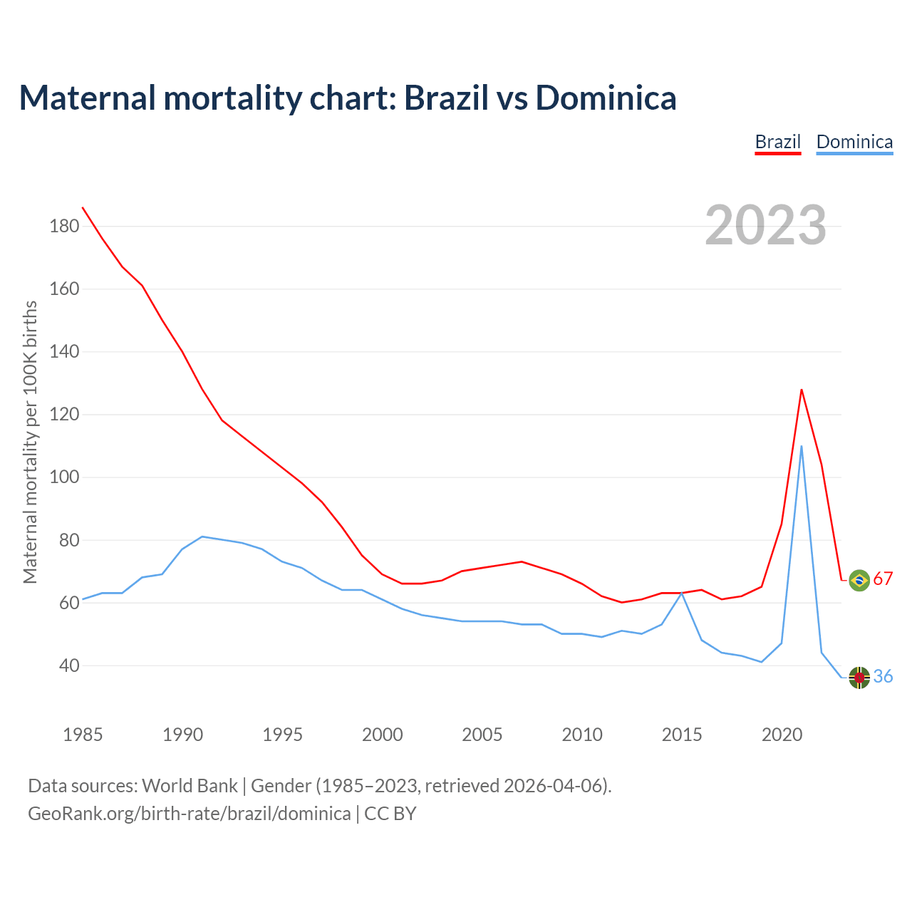 The maternal mortality rate, which is the probability of dying during childbirth or within 42 days of pregnancy termination, is 67 deaths per 100,000 live births in Brazil, compared to 36 deaths in Dominica.