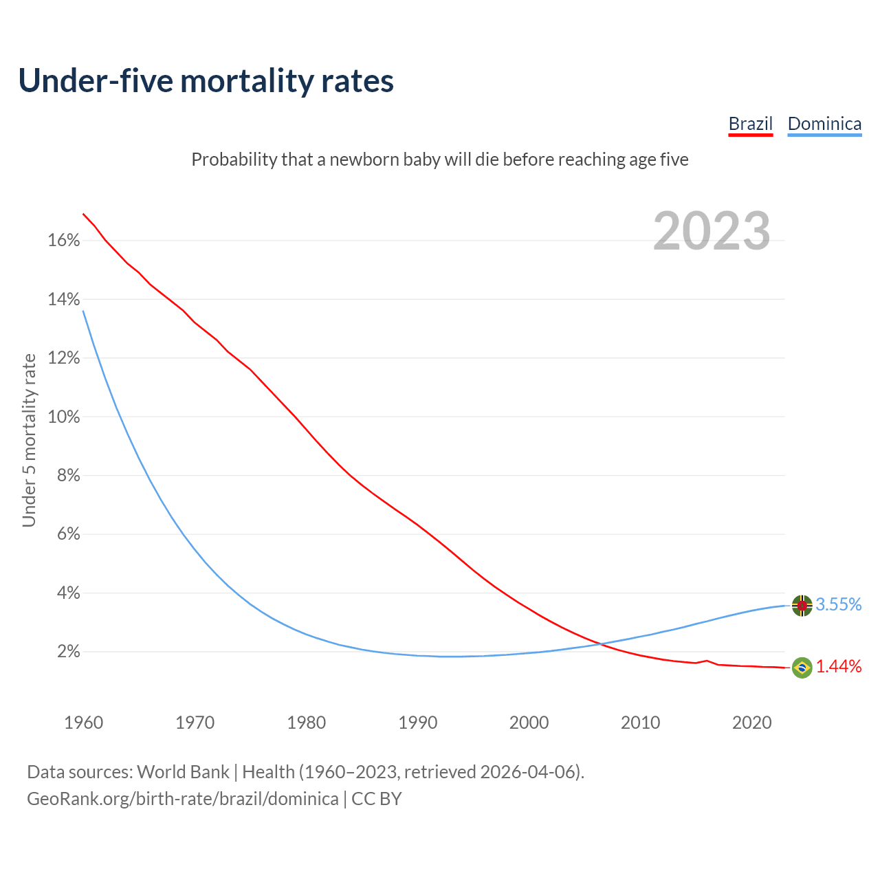 The chance that a newborn baby will die before reaching age five is 1.44% in Brazil and 3.55% in Dominica. Above is a chart with historical data on under-five mortality rates.
