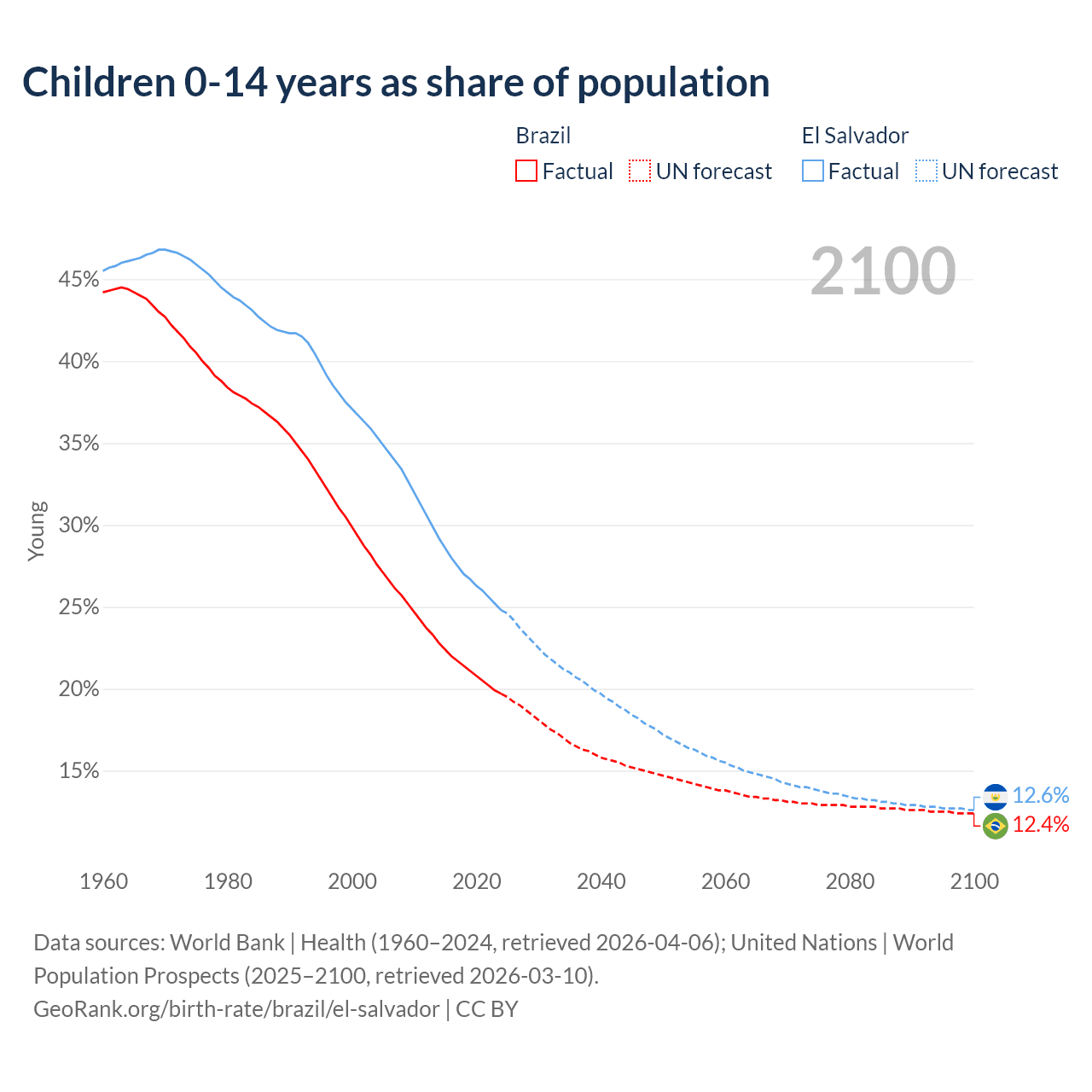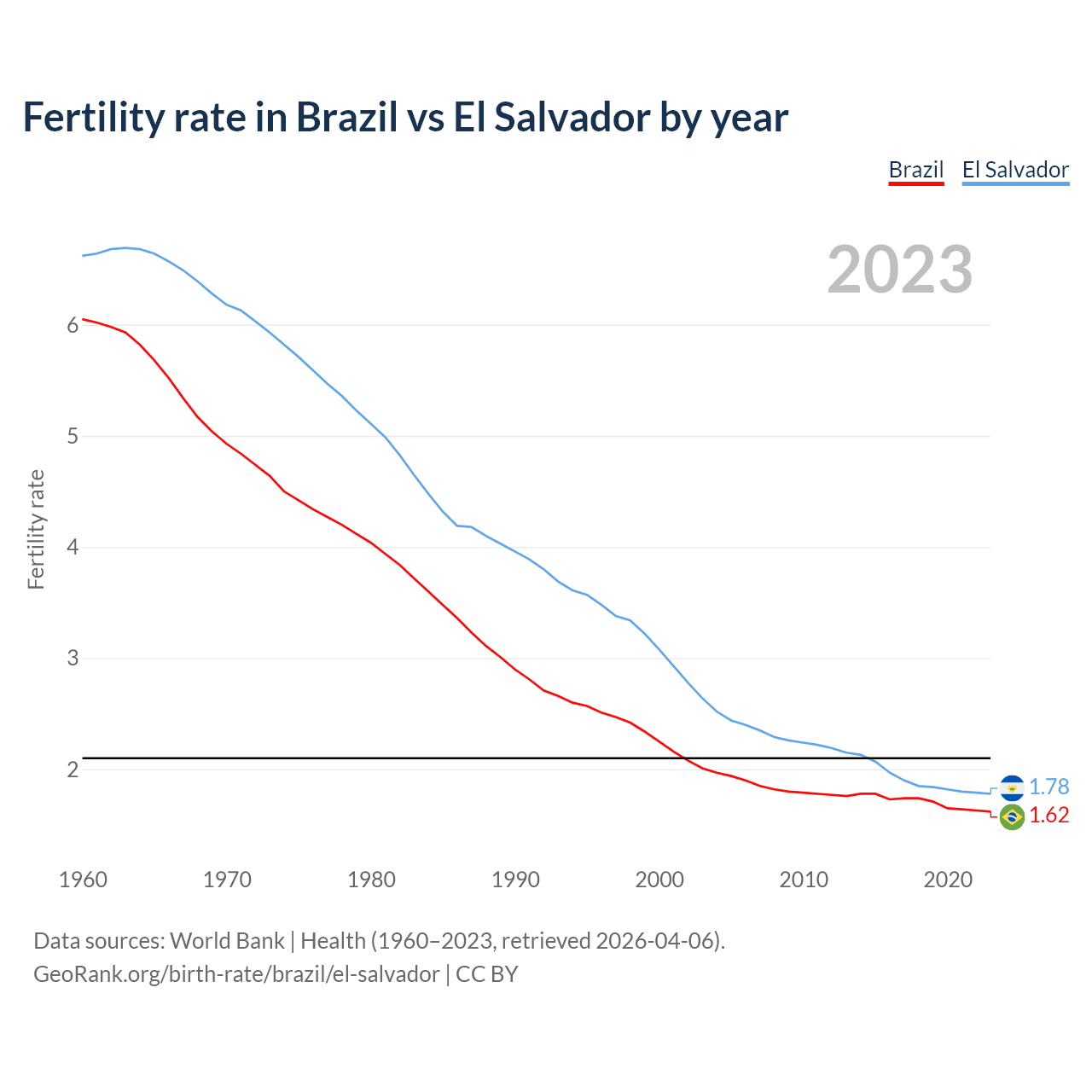 According to the latest available data on birth rates, the fertility rate in Brazil was 1.62 children per woman in 2023, compared to 1.78 in El Salvador in 2023. The replacement level is considered to be 2.1 children per woman.