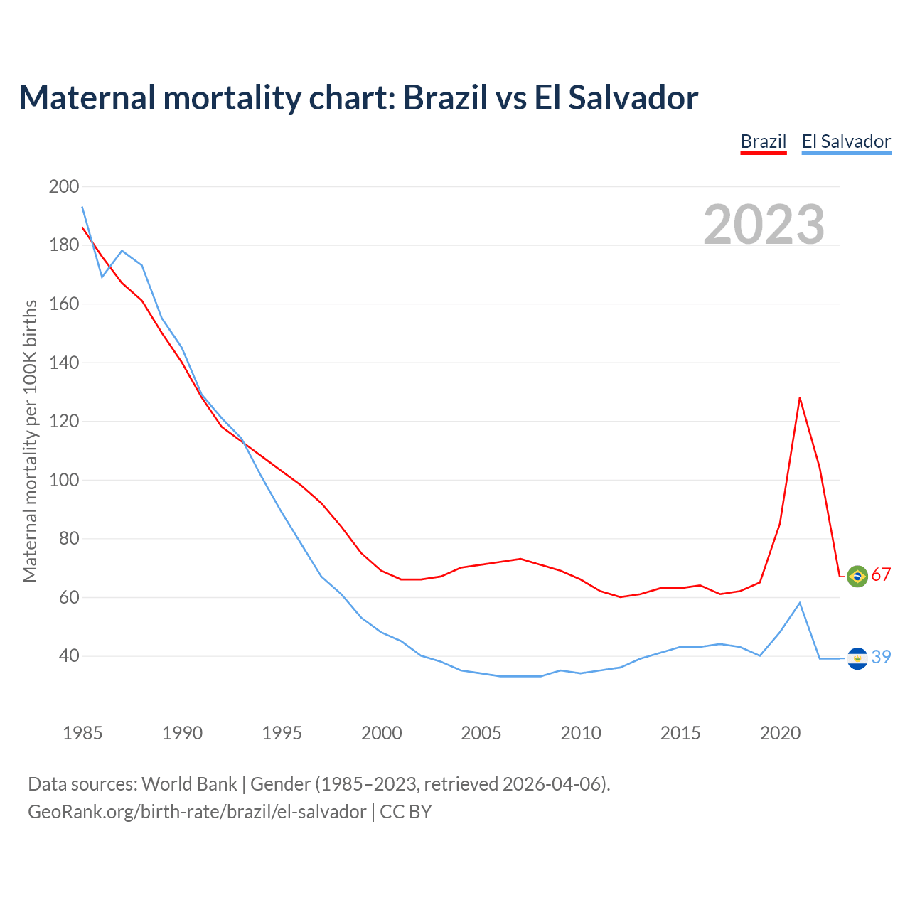 The maternal mortality rate, which is the probability of dying during childbirth or within 42 days of pregnancy termination, is 67 deaths per 100,000 live births in Brazil, compared to 39 deaths in El Salvador.
