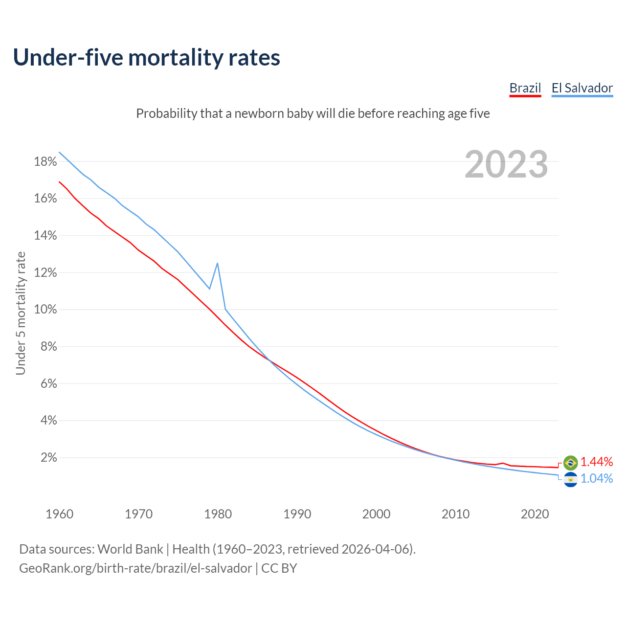 The chance that a newborn baby will die before reaching age five is 1.44% in Brazil and 1.04% in El Salvador. Above is a chart with historical data on under-five mortality rates.