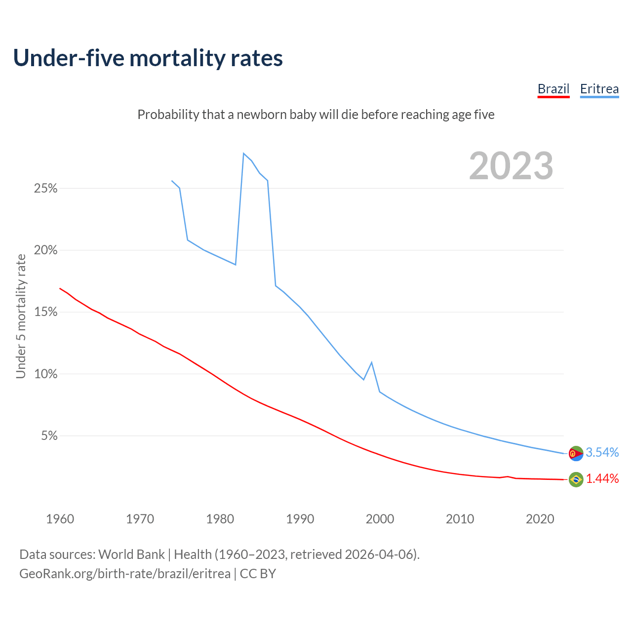 The chance that a newborn baby will die before reaching age five is 1.44% in Brazil and 3.54% in Eritrea. Above is a chart with historical data on under-five mortality rates.