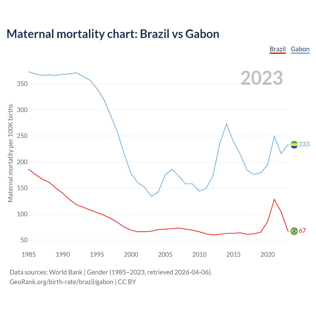 The maternal mortality rate, which is the probability of dying during childbirth or within 42 days of pregnancy termination, is 67 deaths per 100,000 live births in Brazil, compared to 233 deaths in Gabon.