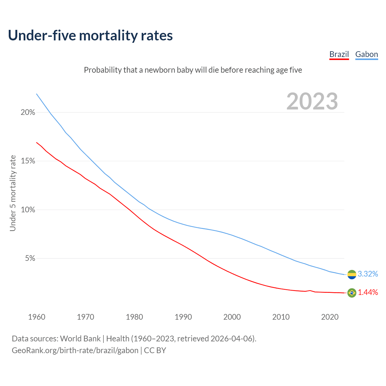 The chance that a newborn baby will die before reaching age five is 1.44% in Brazil and 3.32% in Gabon. Above is a chart with historical data on under-five mortality rates.