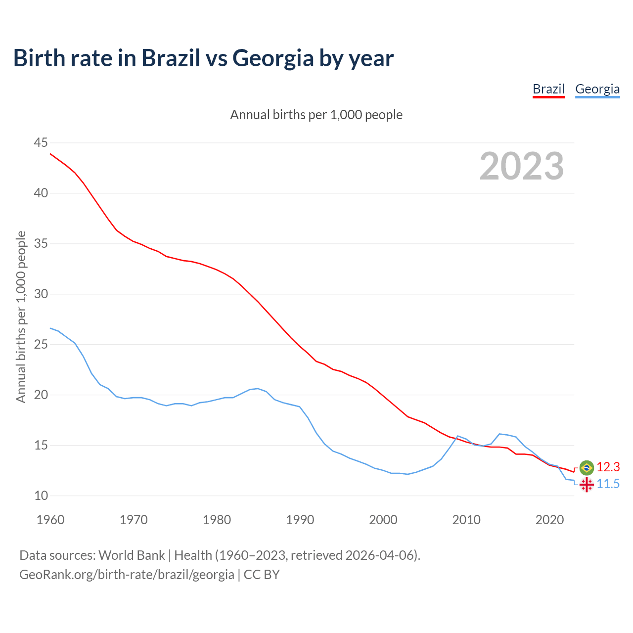 Brazil has an annual birth rate of 12.3 births per 1,000 people, compared to 11.5 for Georgia. The average number of children a woman is expected to have during her lifetime — the fertility rate, is 1.62 in Brazil and 1.81 in Georgia — 11.8% difference.