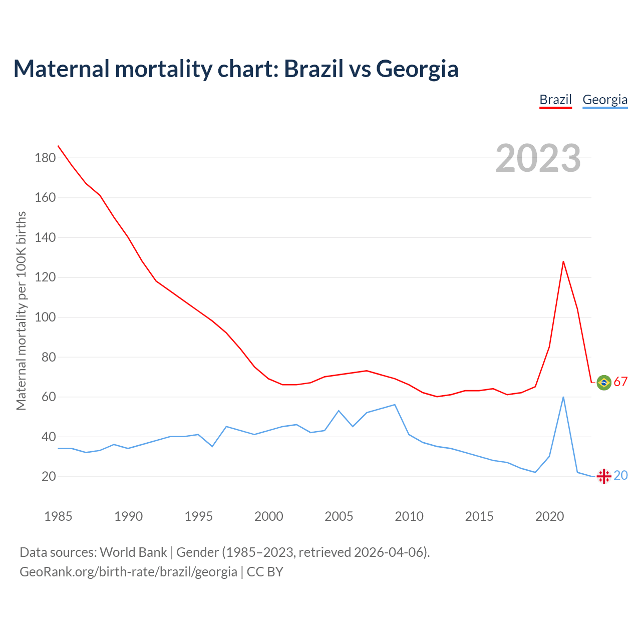 The maternal mortality rate, which is the probability of dying during childbirth or within 42 days of pregnancy termination, is 67 deaths per 100,000 live births in Brazil, compared to 20 deaths in Georgia.