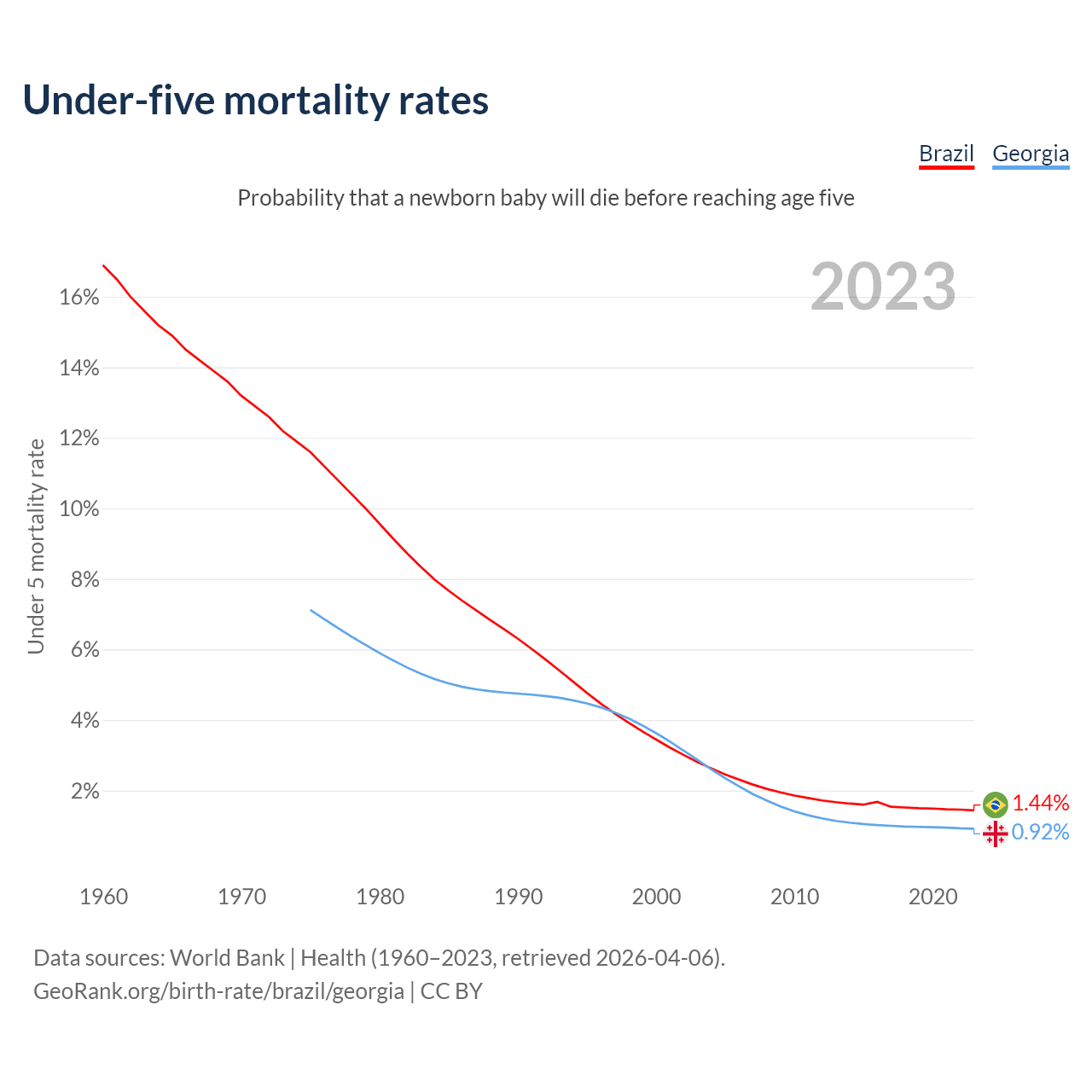 The chance that a newborn baby will die before reaching age five is 1.44% in Brazil and 0.92% in Georgia. Above is a chart with historical data on under-five mortality rates.