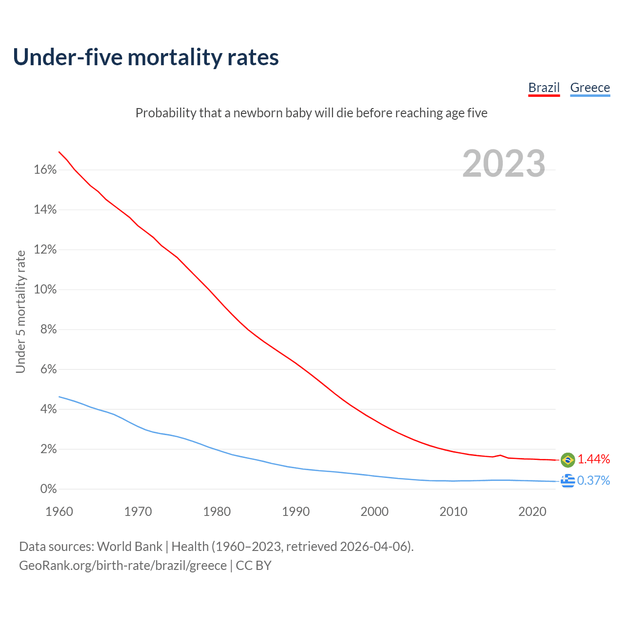 The chance that a newborn baby will die before reaching age five is 1.44% in Brazil and 0.37% in Greece. Above is a chart with historical data on under-five mortality rates.