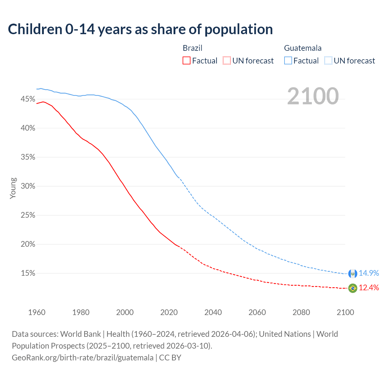 1960 vs 2023, the fertility rate has decreased by 73.2% in Brazil and by 67% in Guatemala — in 1960, it was 6.05 and 7, respectively.