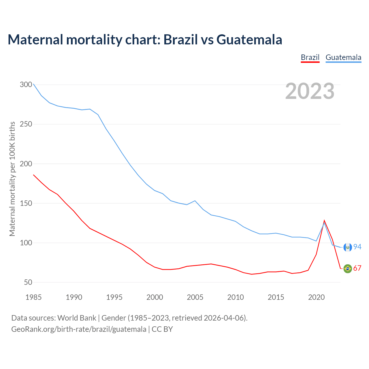 The maternal mortality rate, which is the probability of dying during childbirth or within 42 days of pregnancy termination, is 67 deaths per 100,000 live births in Brazil, compared to 94 deaths in Guatemala.
