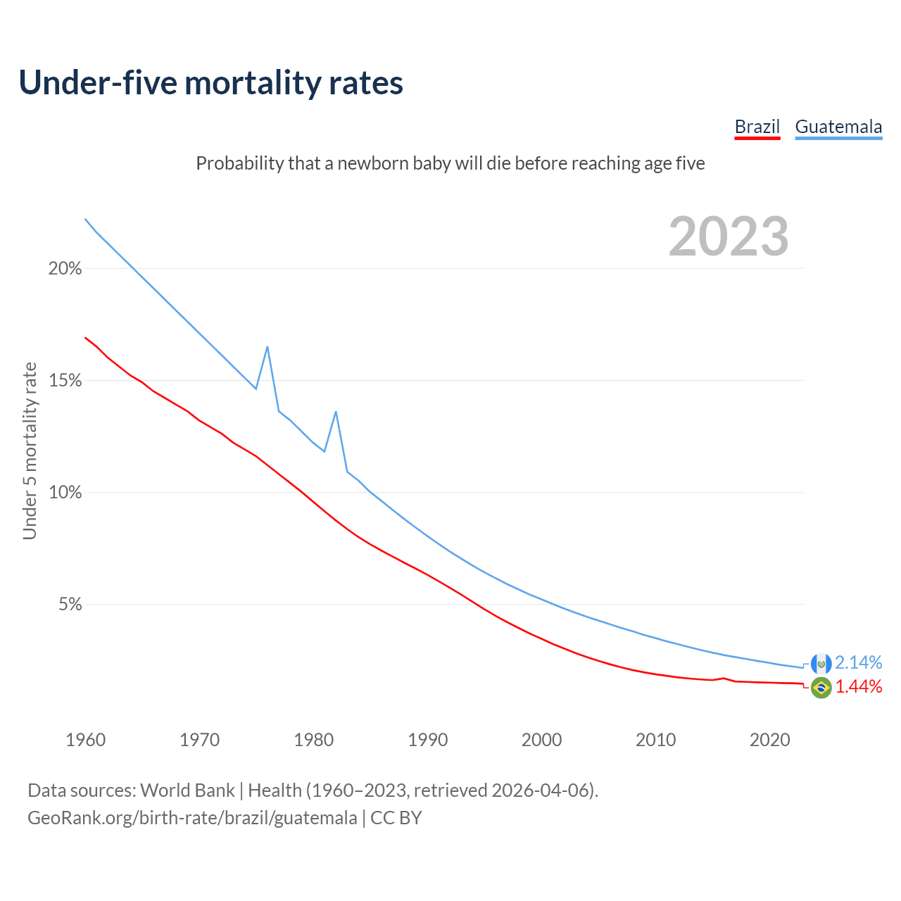 The chance that a newborn baby will die before reaching age five is 1.44% in Brazil and 2.14% in Guatemala. Above is a chart with historical data on under-five mortality rates.