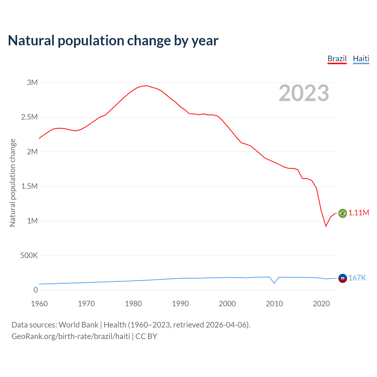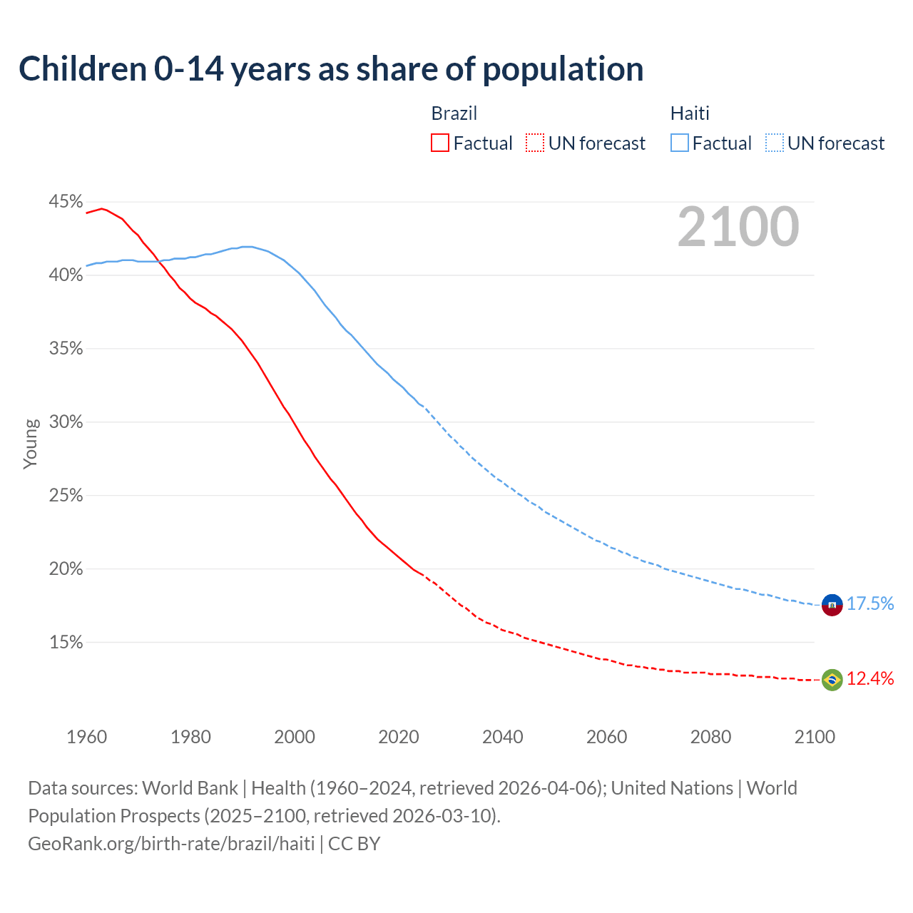 According to the latest available data on birth rates, the fertility rate in Brazil was 1.62 children per woman in 2023, compared to 2.66 in Haiti in 2023. The replacement level is considered to be 2.1 children per woman.