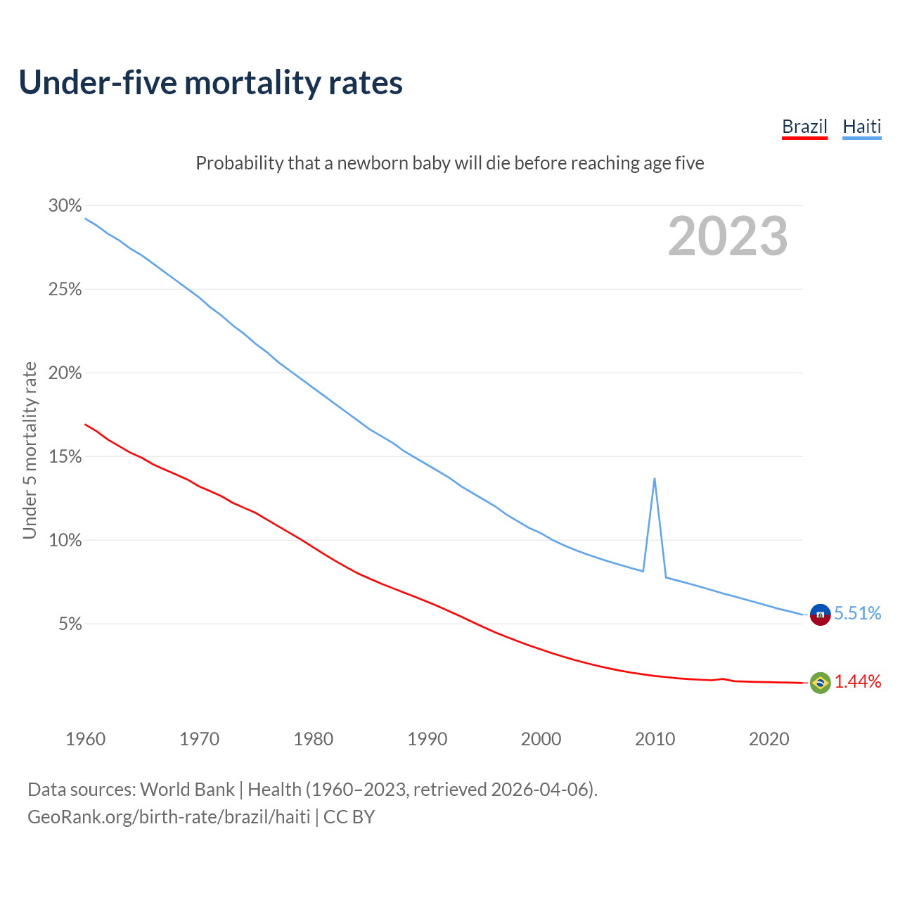 The chance that a newborn baby will die before reaching age five is 1.44% in Brazil and 5.51% in Haiti. Above is a chart with historical data on under-five mortality rates.