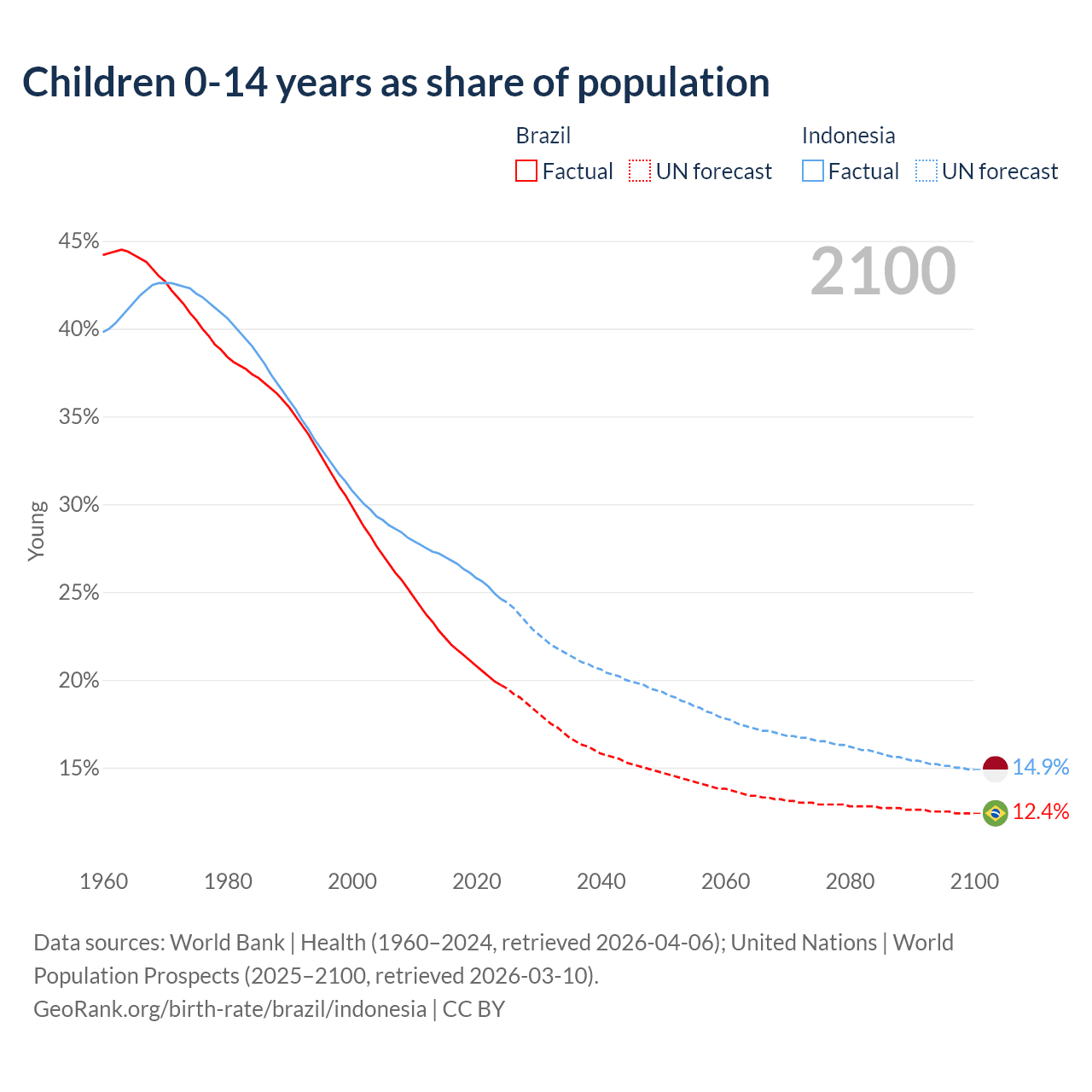 According to the latest available data on birth rates, the fertility rate in Brazil was 1.62 children per woman in 2023, compared to 2.13 in Indonesia in 2023. The replacement level is considered to be 2.1 children per woman.