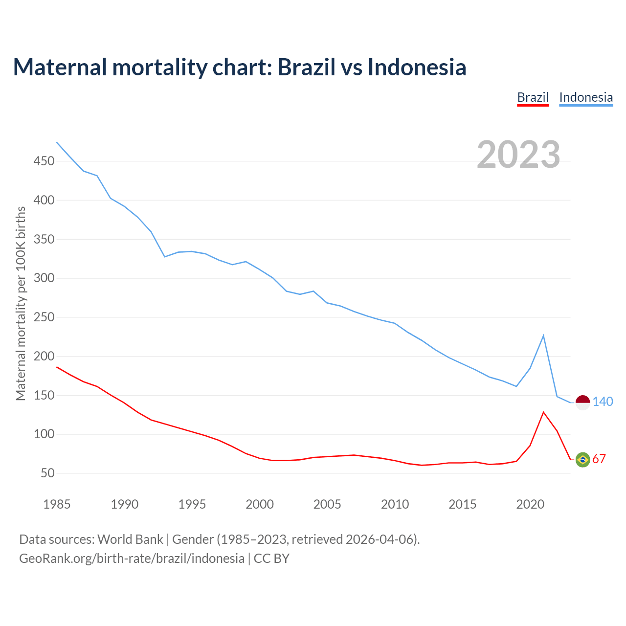 The maternal mortality rate, which is the probability of dying during childbirth or within 42 days of pregnancy termination, is 67 deaths per 100,000 live births in Brazil, compared to 140 deaths in Indonesia.