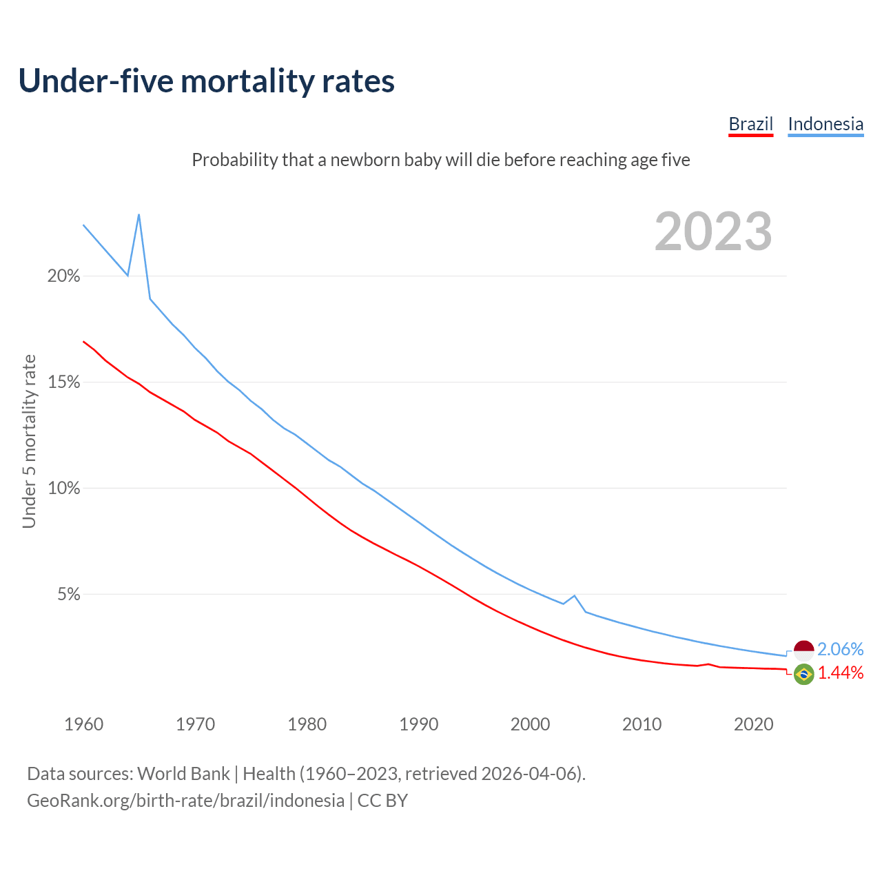 The chance that a newborn baby will die before reaching age five is 1.44% in Brazil and 2.06% in Indonesia. Above is a chart with historical data on under-five mortality rates.