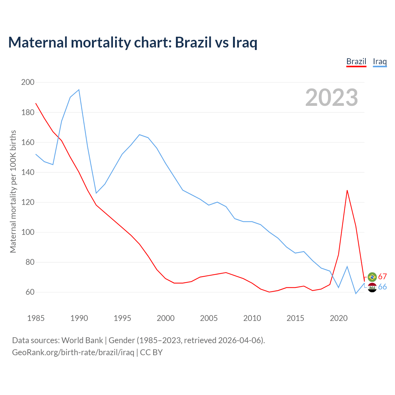 The maternal mortality rate, which is the probability of dying during childbirth or within 42 days of pregnancy termination, is 67 deaths per 100,000 live births in Brazil, compared to 66 deaths in Iraq.