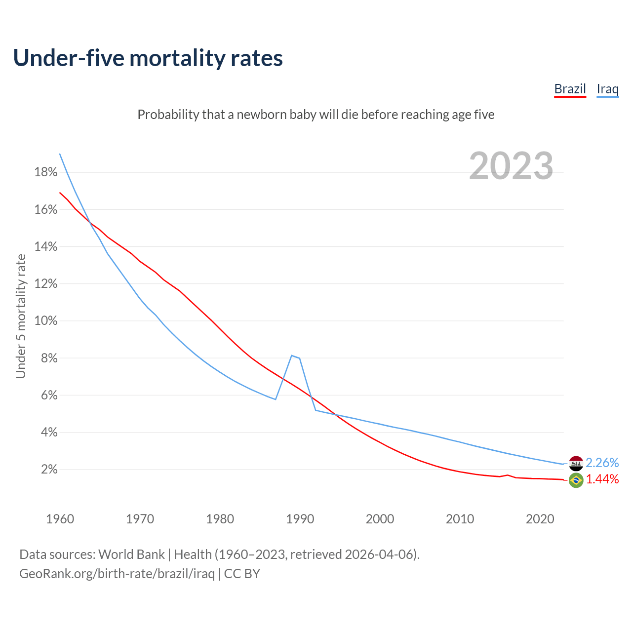 The chance that a newborn baby will die before reaching age five is 1.44% in Brazil and 2.26% in Iraq. Above is a chart with historical data on under-five mortality rates.