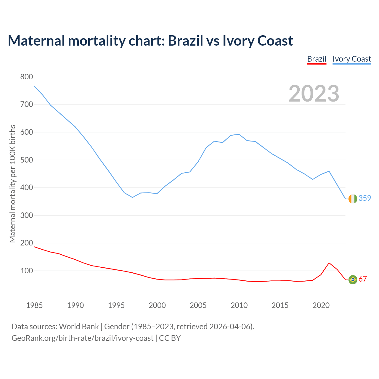 The maternal mortality rate, which is the probability of dying during childbirth or within 42 days of pregnancy termination, is 67 deaths per 100,000 live births in Brazil, compared to 359 deaths in Ivory Coast.