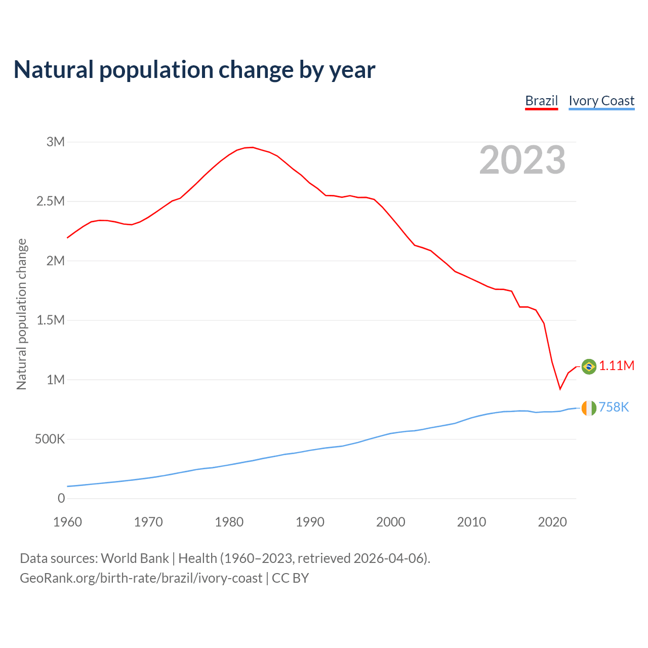 Brazil has an annual birth rate of 12.3 births per 1,000 people, compared to 32 for Ivory Coast. The average number of children a woman is expected to have during her lifetime — the fertility rate, is 1.62 in Brazil and 4.28 in Ivory Coast — 164.5% difference.