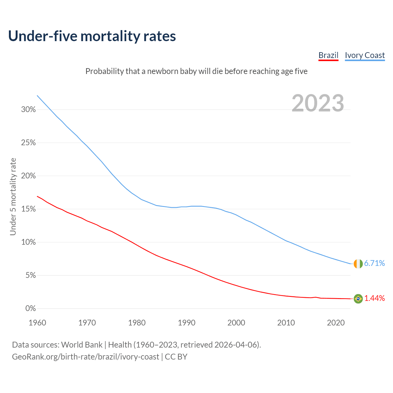 The chance that a newborn baby will die before reaching age five is 1.44% in Brazil and 6.71% in Ivory Coast. Above is a chart with historical data on under-five mortality rates.